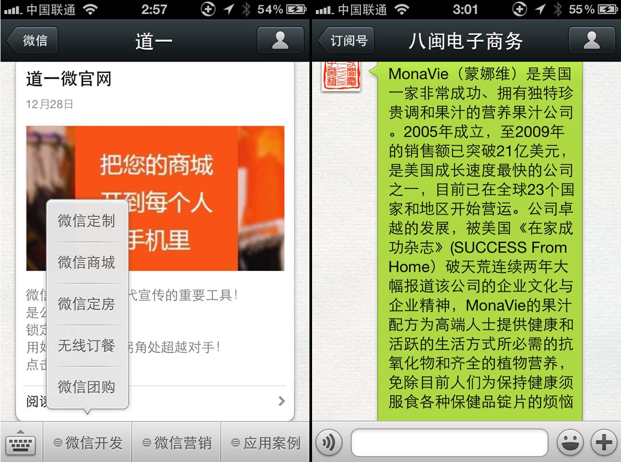 微信公眾平臺(tái),利用公眾賬號(hào)平臺(tái)進(jìn)行自媒體活動(dòng),簡(jiǎn)單來(lái)說(shuō)就是進(jìn)行一對(duì)多的媒體性行為活動(dòng),商家通過(guò)申請(qǐng)公眾微信服務(wù)號(hào)通過(guò)二次開(kāi)發(fā)展示商家微官網(wǎng)、微會(huì)員、微推送、微支付、微活動(dòng),微報(bào)名、微分享、微名片等,已經(jīng)形成了一種主流的線上線下微信互動(dòng)營(yíng)銷方式。